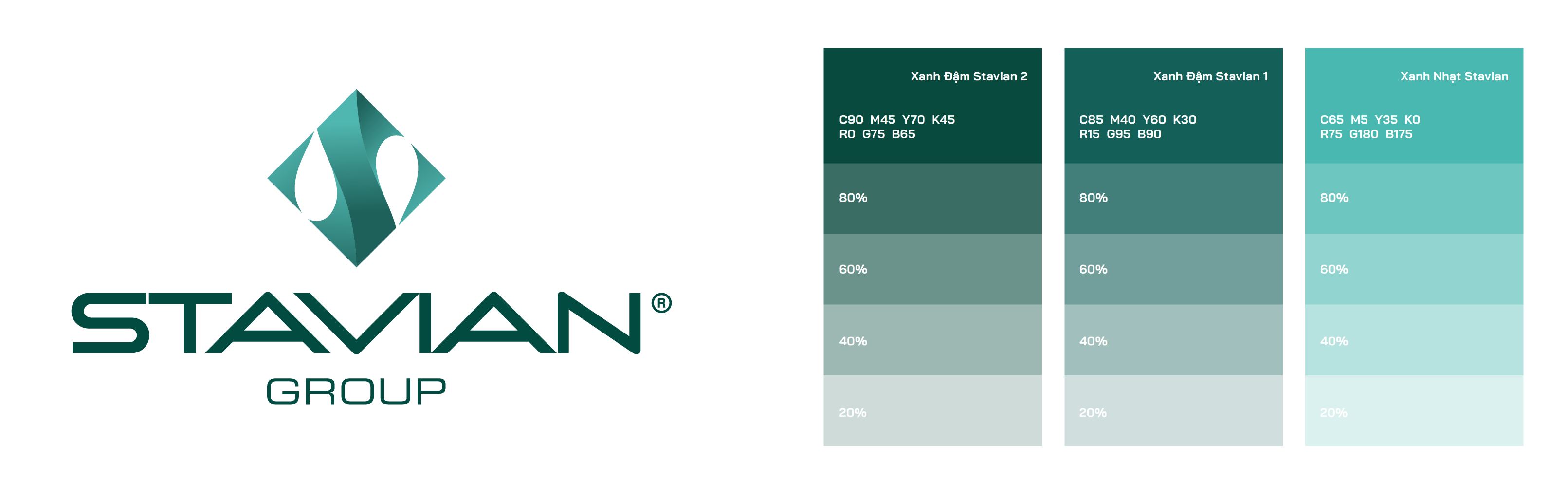 - Tên thương hiệu “Stavian” mang những đường nét đều, vuông, rộng tương đồng với nét khoẻ khoắn, chính trực và công nghiệp của biểu tượng hình thoi trong logo. Đồng thời, chữ V trong cụm từ “Stavian” nằm tại trọng tâm mở ra một góc 90 độ, đồng trục và đăng đối với phần biểu tượng như một bệ đỡ chắc chắn.